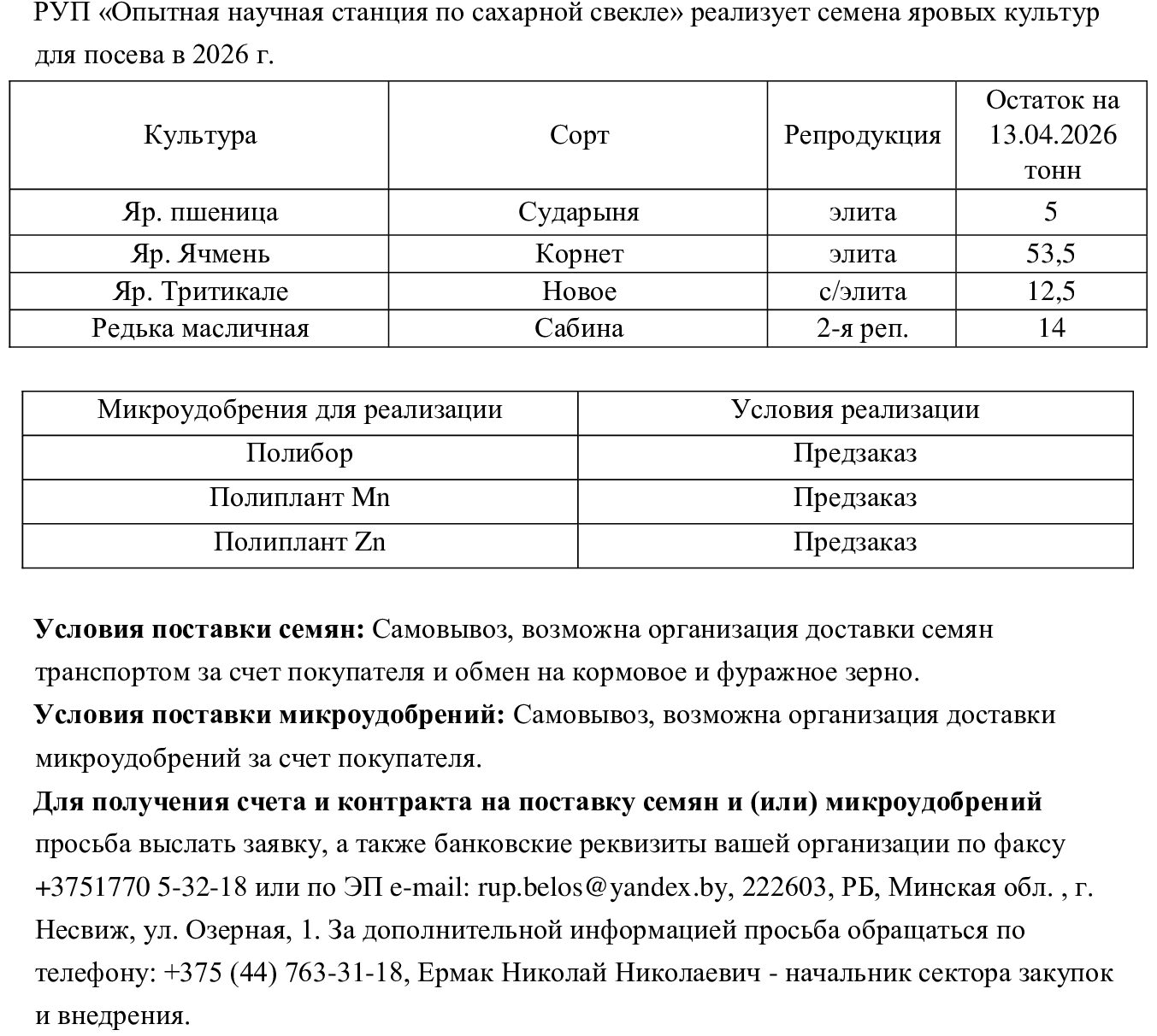РУП «Опытная научная станция по сахарной свекле» реализует семена яровых культур для посева в 2026 г.