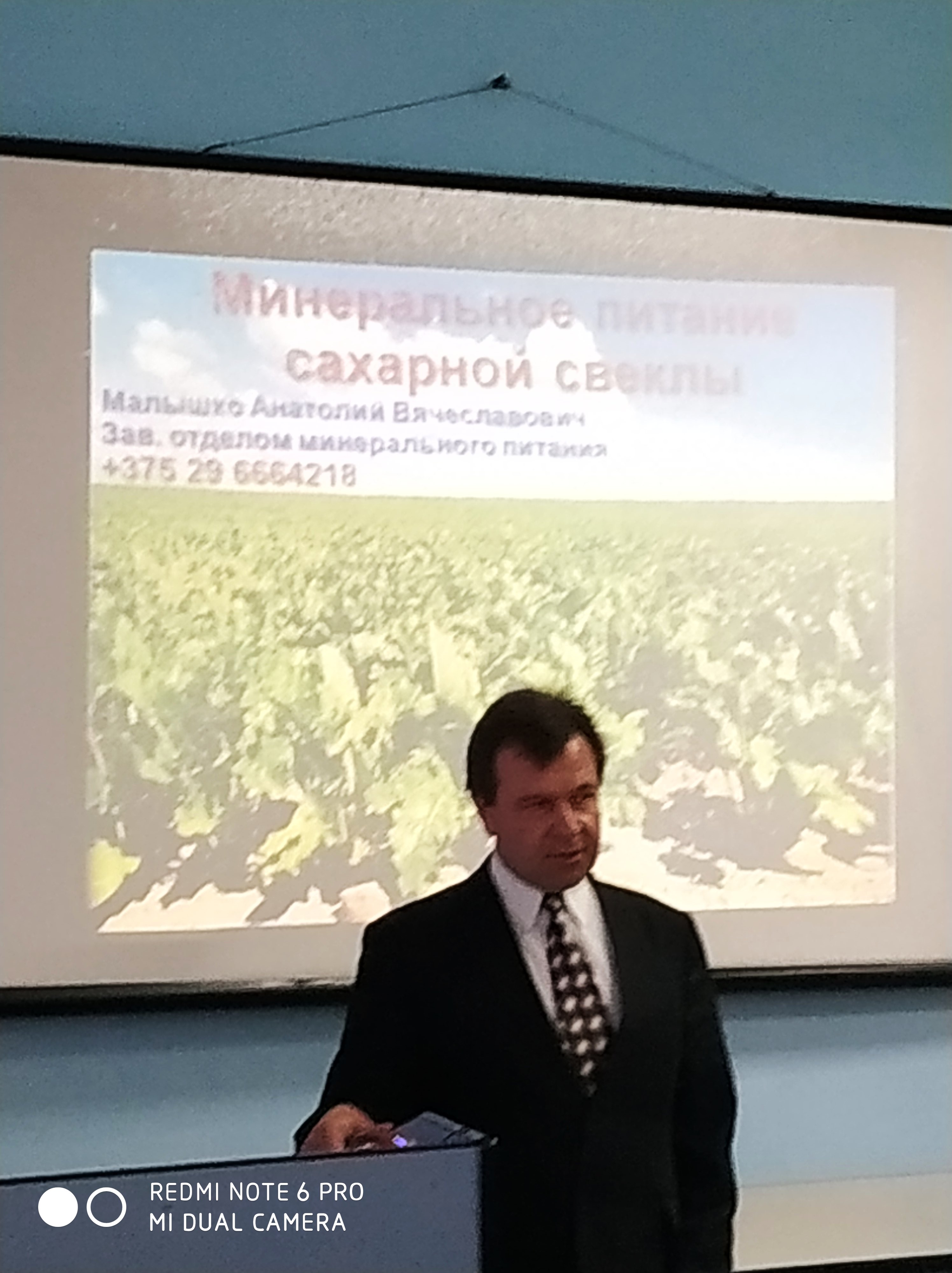 Малышко Анатолий Вячеславович, заведующий отделом минерального питания рассказал об особенностях минерального питания сахарной свеклы,  о приемах управления процессом формирования урожая и сахаронакопления  на основе корневого питания макро- и микроэлементами, контроля и коррекции минерального питания в процессе вегетации, позволяющего реализовать генетический потенциал сахарной свеклы.