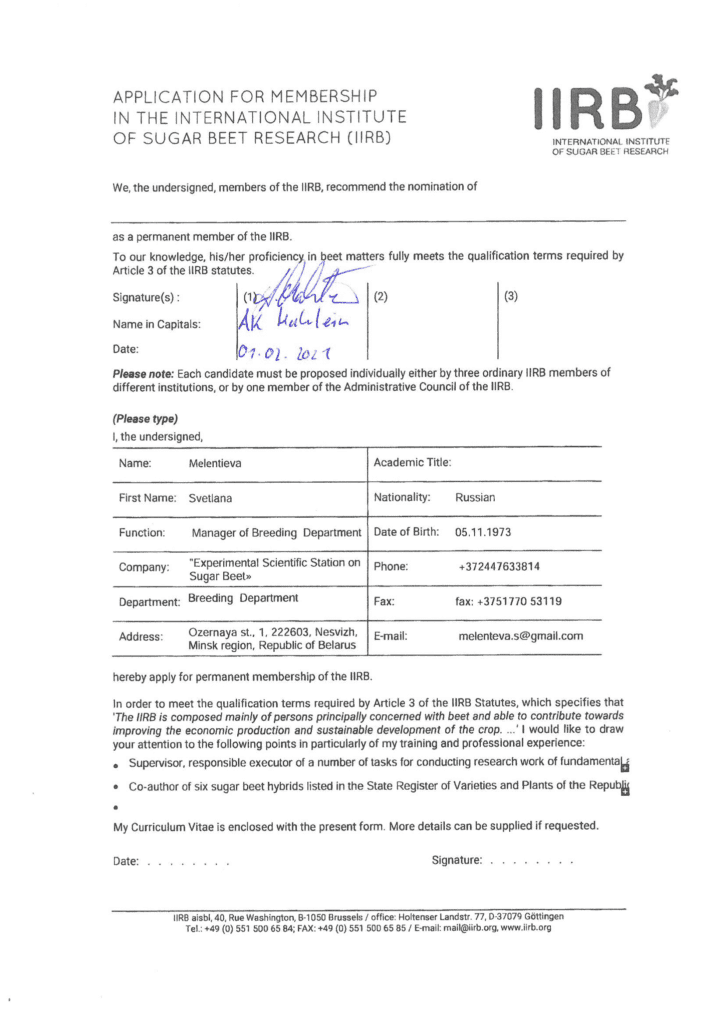 После проведенного совещания РУП «Опытная научная станция по сахарной свекле» было предложено стать членом Международного института исследований сахарной свеклы IIRB, и первого февраля было получено официальное подтверждение членства нашей организации в IIRB.