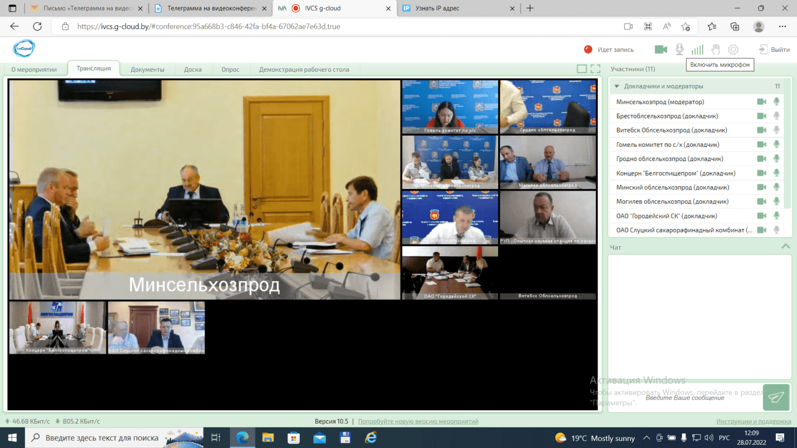 28 июля 2022 г.  Министерство сельского хозяйства и продовольствия провело совещание в режиме видеоконференции по вопросам состояния посевов сахарной свеклы, проведения уходных работ на ее посевах, подготовки уборочной техники и подбора свеклопригодных почв на 2023 г.