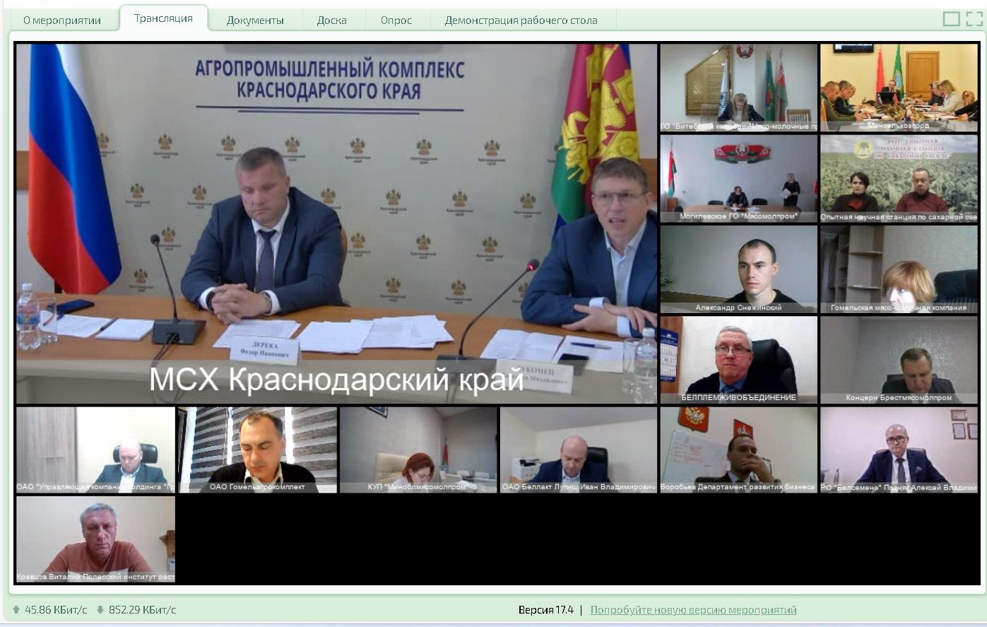 8 ноября в формате видеоконференцсвязи состоялась рабочая встреча двух ведомств: Министерства сельского хозяйства и продовольствия Республики Беларусь и Министерства сельского хозяйства и перерабатывающей промышленности Краснодарского края. В совещании приняли участие Министры сельского хозяйства данных регионов, а также представители научных, сельскохозяйственных и производственных организаций, заинтересованных в сотрудничестве. Целью совещания было обсуждение вопроса развития взаимовыгодных и плодотворных отношений с Краснодарским краем Российской Федерации в сфере сельского хозяйства. На повестке дня, помимо других вопросов, было обсуждение состояния и перспектив совместной работы в области селекции и семеноводства сахарной свеклы, обеспечение регионов семенами. Директор Опытной станции В.П. Гнилозуб поделился опытом и результатами совместной работы с данным регионом РФ, выразил заинтересованность в развитии дальнейшего сотрудничества.